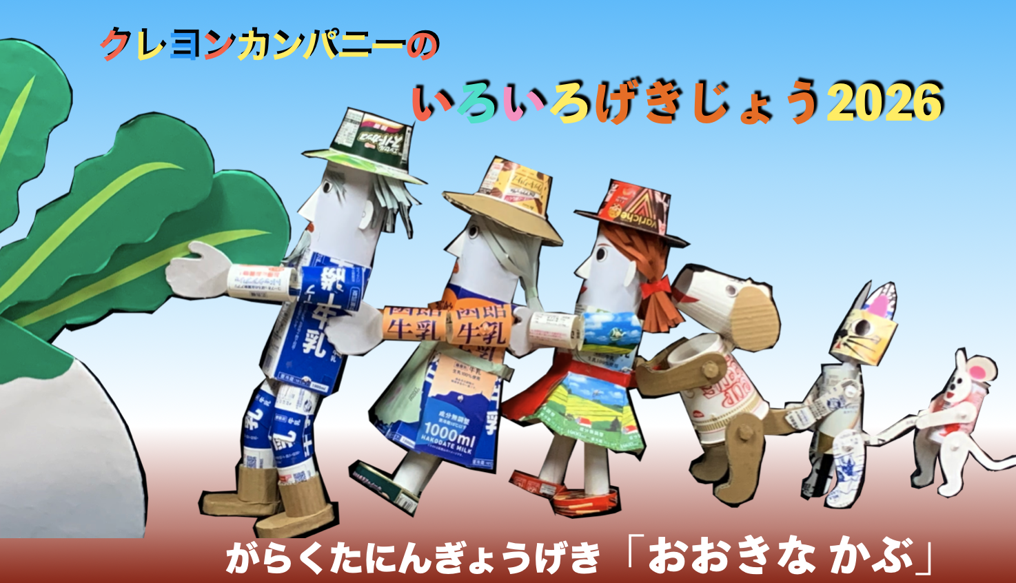 身近な廃品を利用した人形の「がらくた人形劇」シリーズです。同一規格でありながら丈夫で多様な色模様が特徴の牛乳パックをはじめ、麺やアイスクリームのカップなどを彩色せず、なるべく原型を残して製作した人形たちに命が吹き込まれます。おなじみの「大きなかぶ」のお話は繰り返しの面白さとリズミカルな掛け声で幼い子どもたちも楽しめます。一人で動かす独特の工夫や仕掛けの解説(種明かし)もその場で行うので今後の創作意欲も一層増すことでしょう。